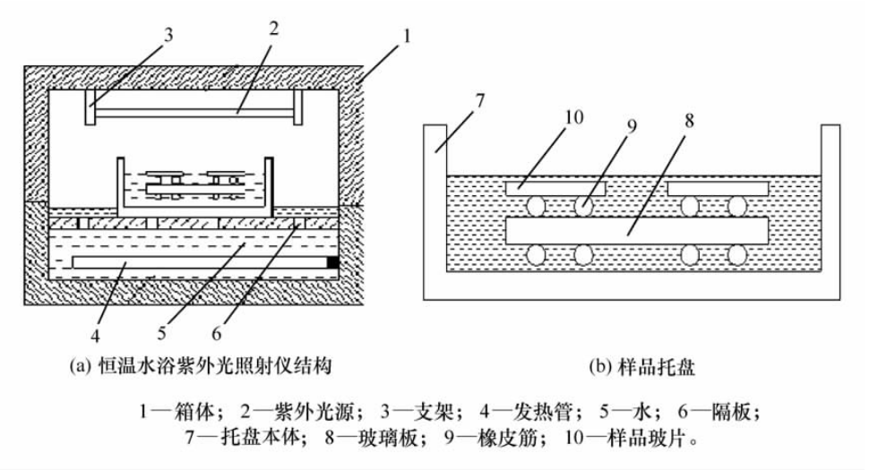 儀器研制主要解決三個問題,一是儀器的外形構造,二是儀器的內部裝置結構,三是儀器各部分功能協調性與安全。該儀器的整體構造為長方形箱型,內設水浴恒溫裝置、樣品托盤和紫外光源。內部裝置的主要功能是必須在恒溫水浴條件下進行定量的紫外光照射,同時儀器需要密閉,防止紫外光外泄;樣品玻片在樣品托盤上水平放置,使樣品玻片能被薄層浸浴,紫外光能均勻地照射在樣品玻片上。為實現上述目的,恒溫水浴紫外光照射儀采用如下設計方案:恒溫水浴紫外光照射儀由箱體、紫外光源、支架、發熱 管、隔板、樣品托盤、玻璃板、橡皮筋組成,見圖1。