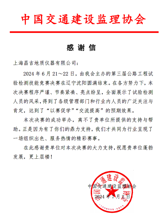 賽后我司收到中國(guó)交通建設(shè)監(jiān)理協(xié)會(huì)主的感謝信,上海昌吉作為此次競(jìng)賽的支持方之一,收到主辦方的感謝信尤為欣喜,能在比賽平臺(tái)的搭建中提供強(qiáng)有力的保障設(shè)備,助力在建設(shè)事業(yè)中背后付出汗水的檢測(cè)試驗(yàn)人員安心參賽。